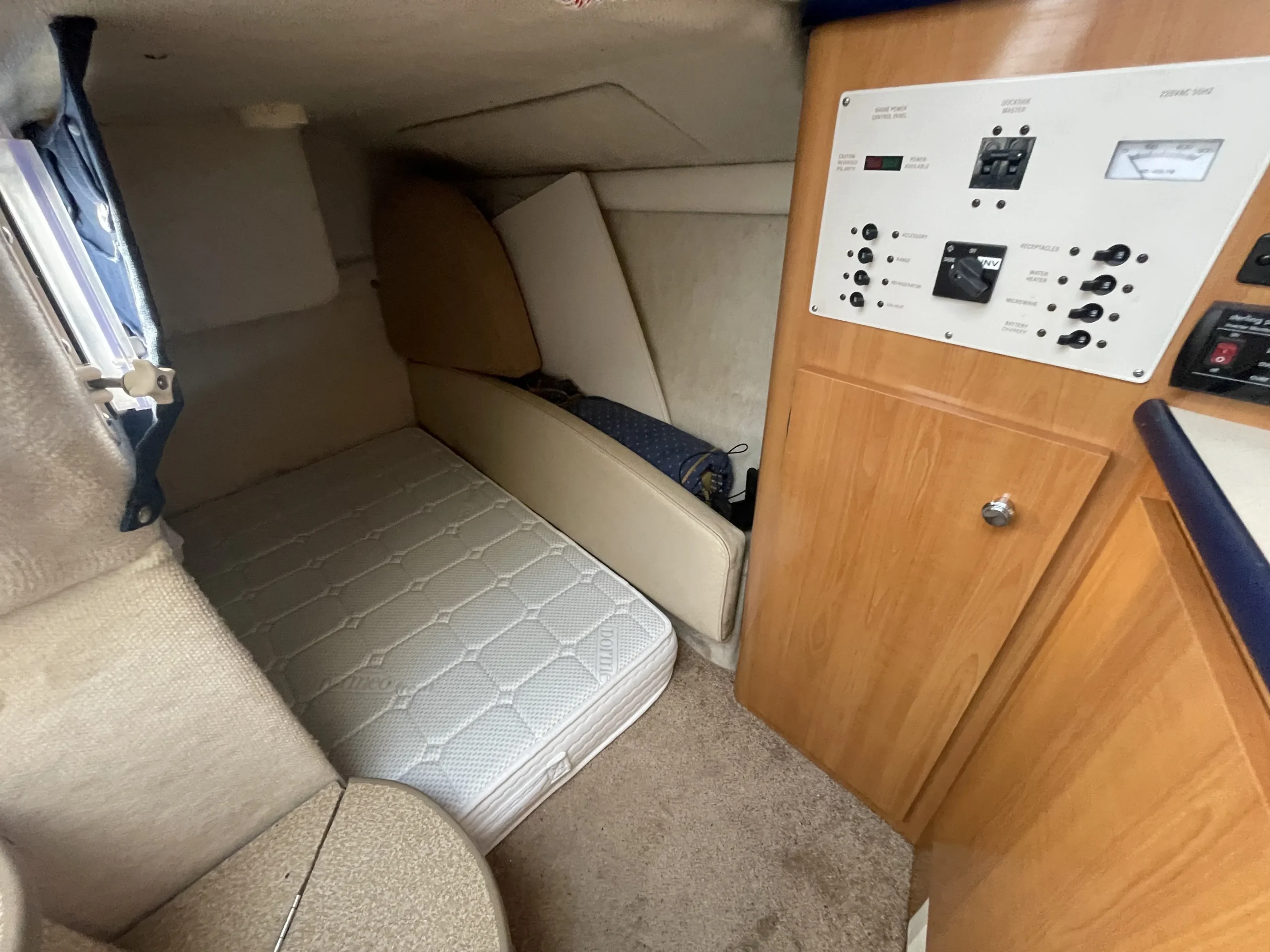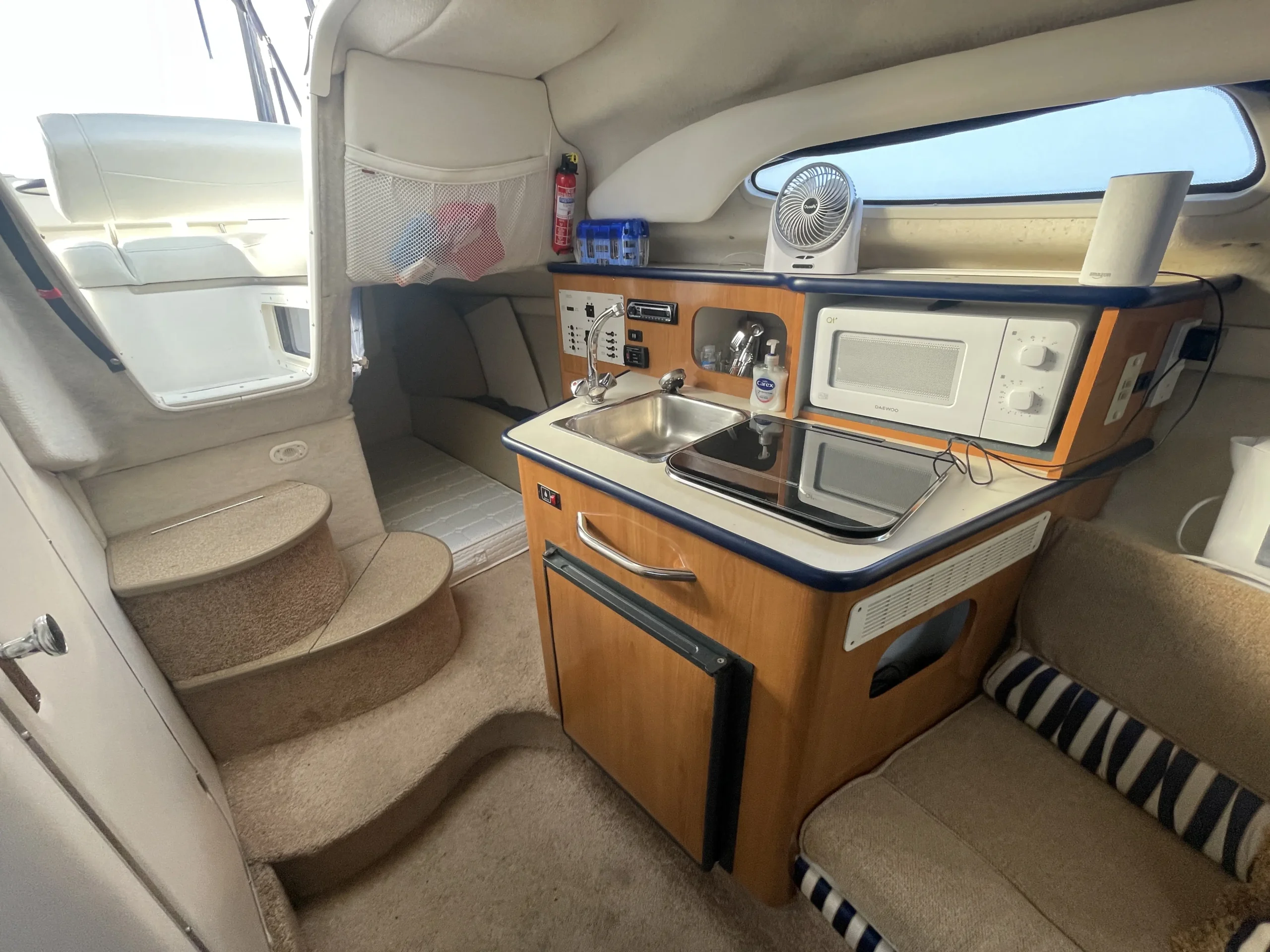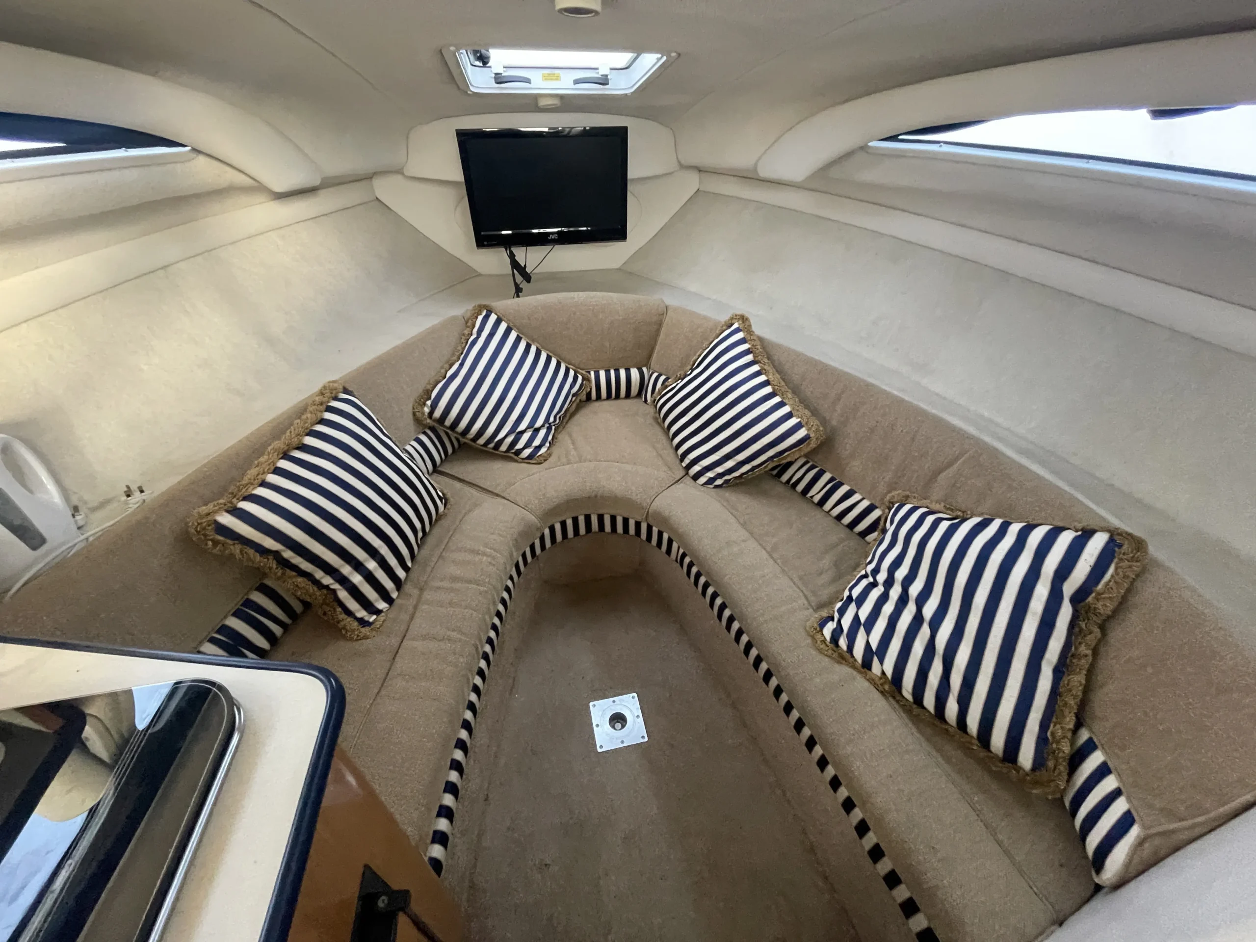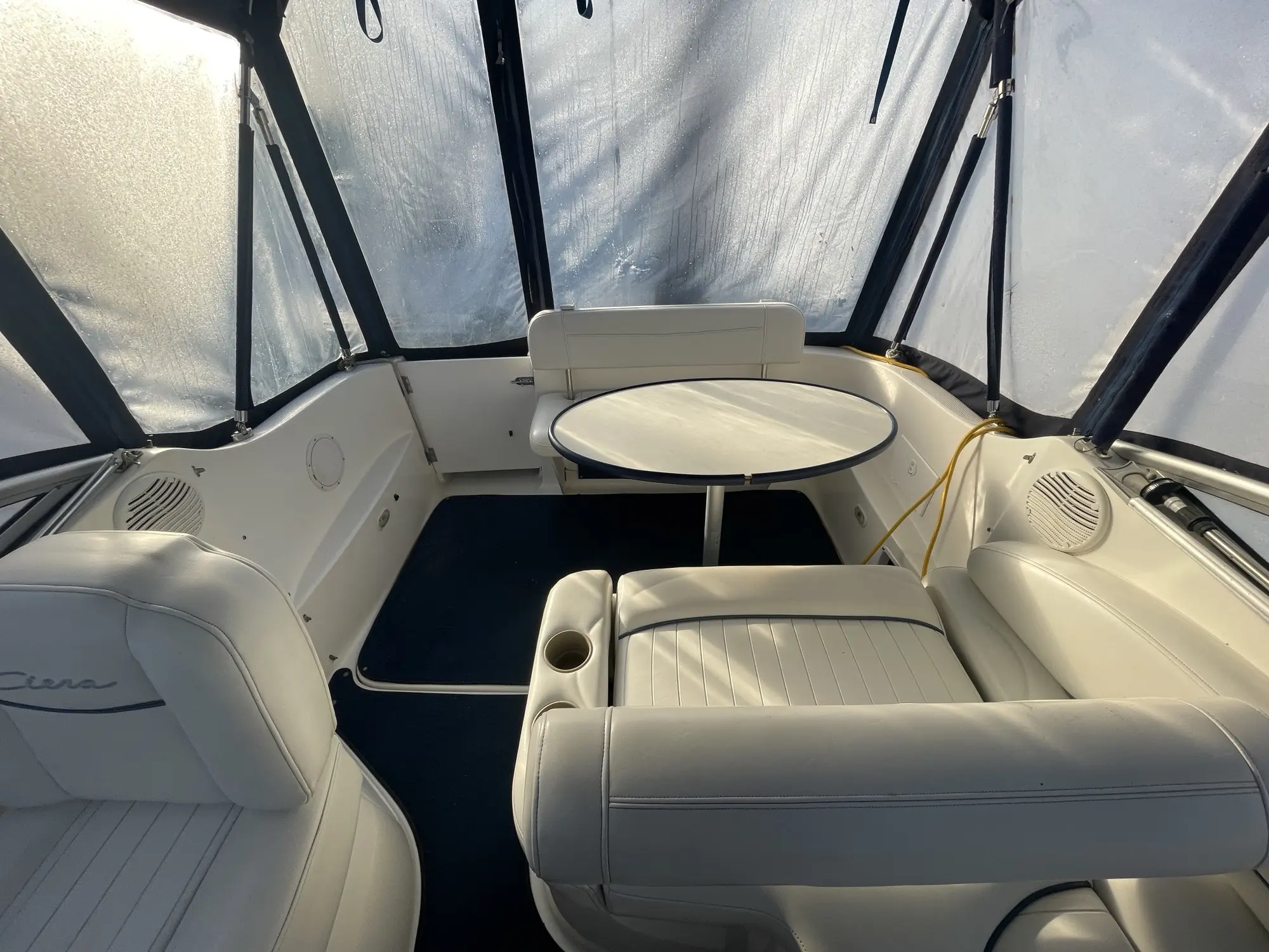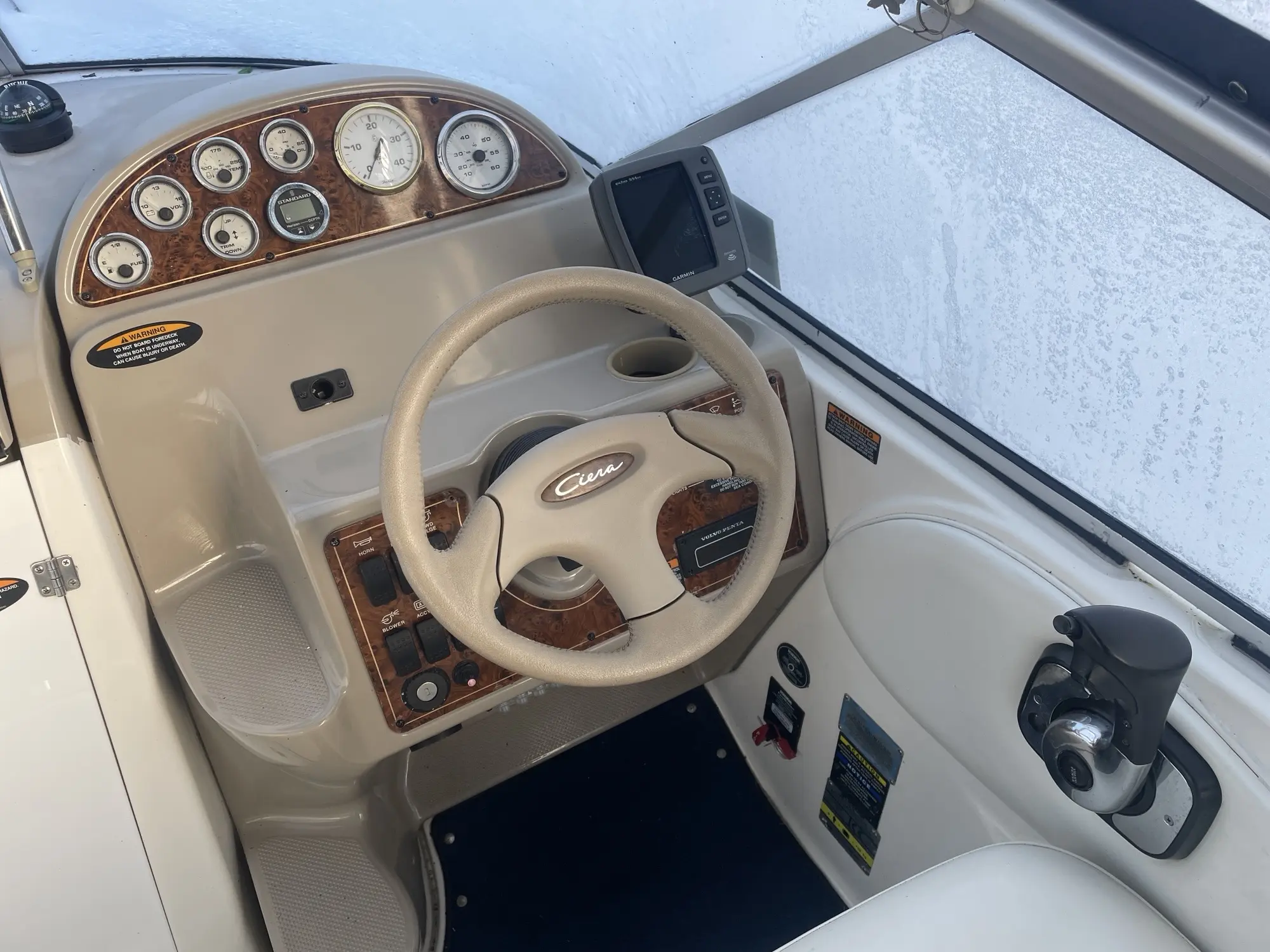 The Bayliner 245 family cruiser features a roomy, one level cockpit with L-shaped seating that converts to a sun lounge, an enclosed head with a shower, and a mid cabin private berth.